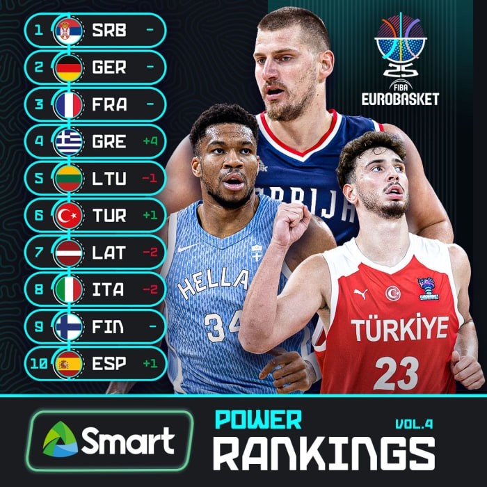 8月25日讯 欧锦赛将在27日开战,各支球队的最终阵容也已确定,FIBA官方公布了最新一期的实力榜,具体如下: