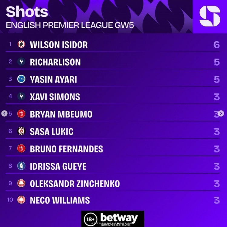 英超第5轮射门榜: