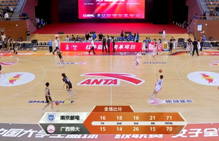 末节决战,李靖蕾上来连砍5分帮助南京邮电咬住比分,禤思雨能突破回应,双方命中率都有下降打了半节都未得分上双。罗欣三分命中后刘玲迅速回应answer ball,广西师大掌握住两球以上领先。倪诗睿和李靖蕾连续突破打成追到差1分,罗欣强攻不中,李靖蕾强攻不中后,还剩0.9秒南京邮电底线发球,倪诗睿压哨上篮绝杀,最终南京邮电71-70险胜广西师大。