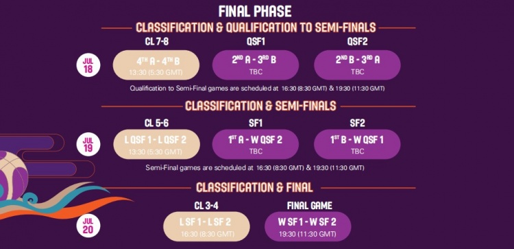 根据女篮亚洲杯的赛制,小组赛结束后,每个小组的小组第一直接晋级半决赛,A组的小组第二和B组的小组第三,以及A组的小组第三和B组的小组第二进行单场决胜,争夺剩下两个半决赛名额。