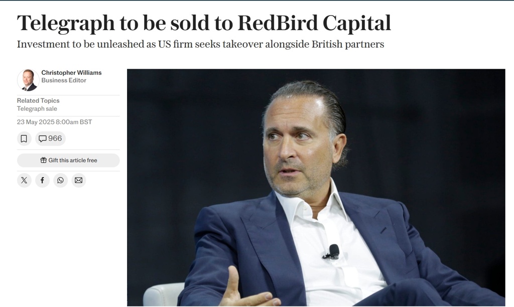 05月24日讯 经过两年动荡期,《每日电讯报》即将迎来转机。根据初步协议,这家英国老牌媒体将被红鸟资本(RedBird Capital Partners)牵头的跨大西洋财团收购,此举将为新闻业务注入重大投资。