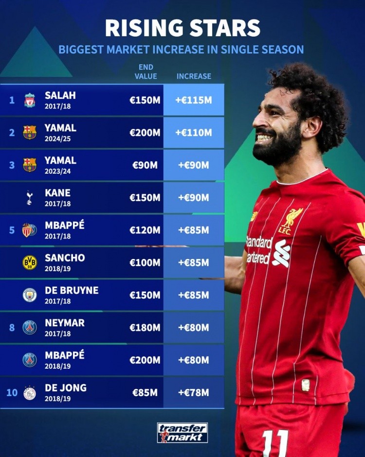 6月11日讯 德转列球员单赛季身价增幅榜,17-18赛季萨拉赫+1.15亿欧居首,24-25赛季亚马尔+1.1亿欧第二。