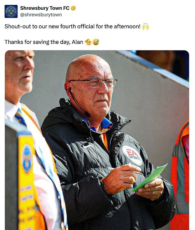 什鲁斯伯里在社媒上发布照片并写道:“向我们今天下午的新第四官员致敬!谢谢你救场,艾伦。”