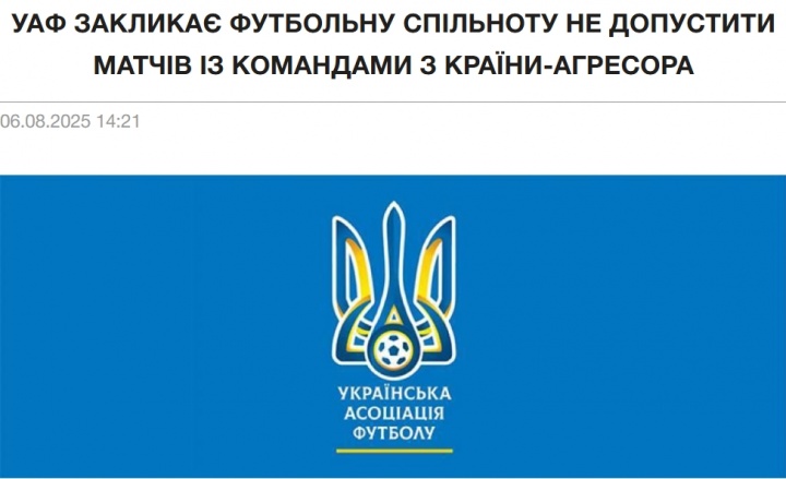 “乌克兰足协已向国际足联、亚足联、欧足联和约旦足协发出正式信函,针对俄罗斯球队参加国际友谊赛、以及计划于2025年9月4日在莫斯科举行的俄罗斯和约旦之间的国际友谊赛。”